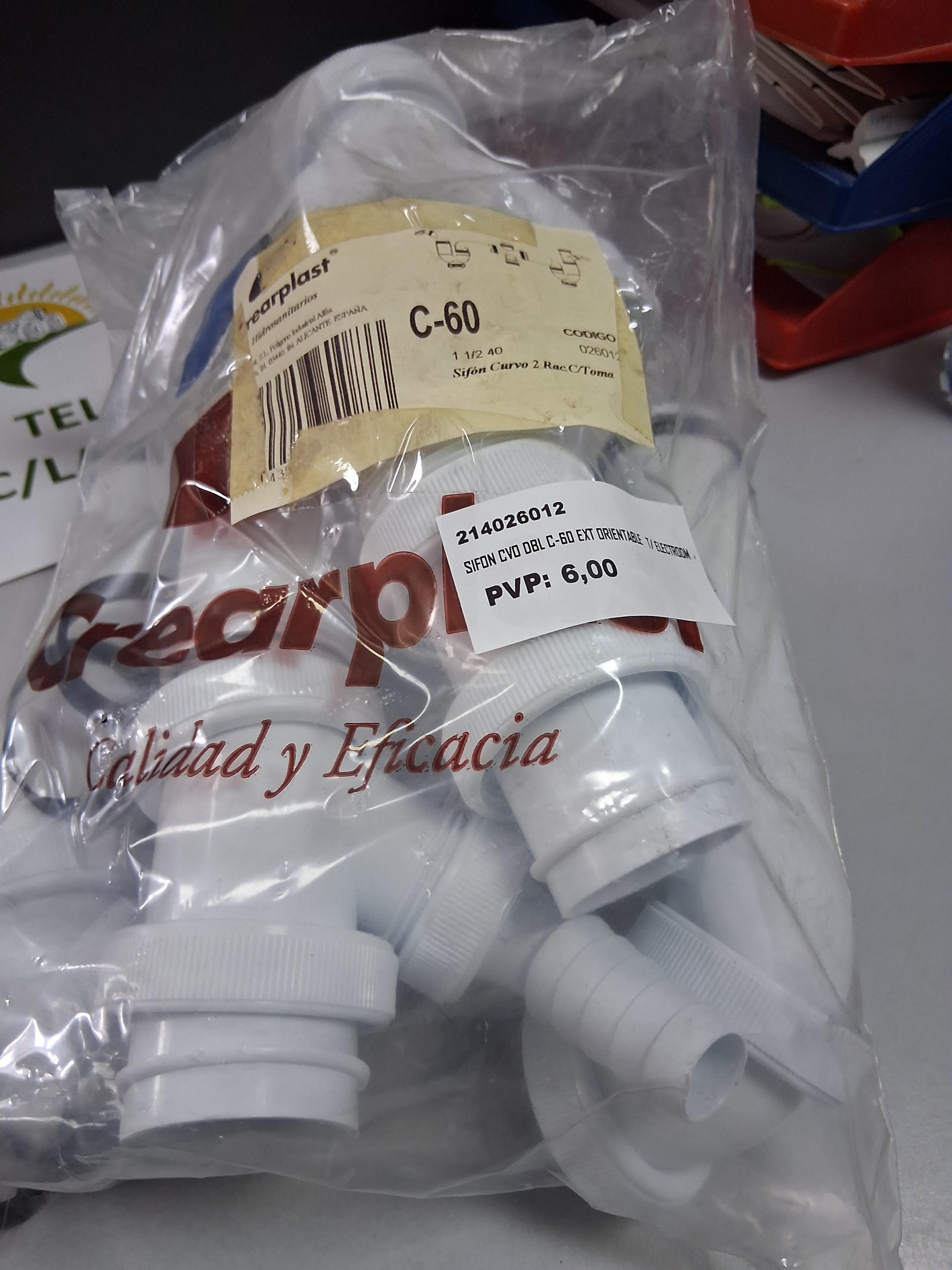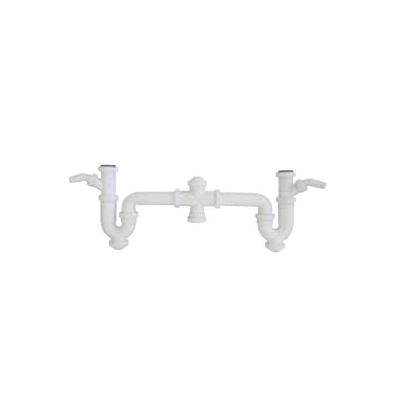Sifón curvo con doble seno con racords extensibles orientables y doble toma de lavavajillas (tuercas locas) para tubo de 40 mm de diámetro.